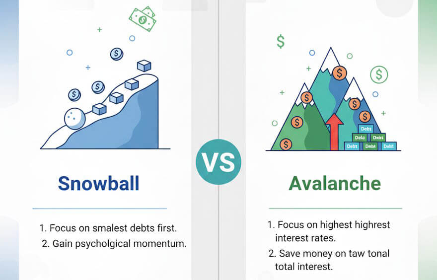 Debt Snowball: Pay off your smallest balance first while making minimum payments on the rest. When the smallest debt is gone, roll that payment into the next-smallest balance — like a snowball gathering size and momentum.
